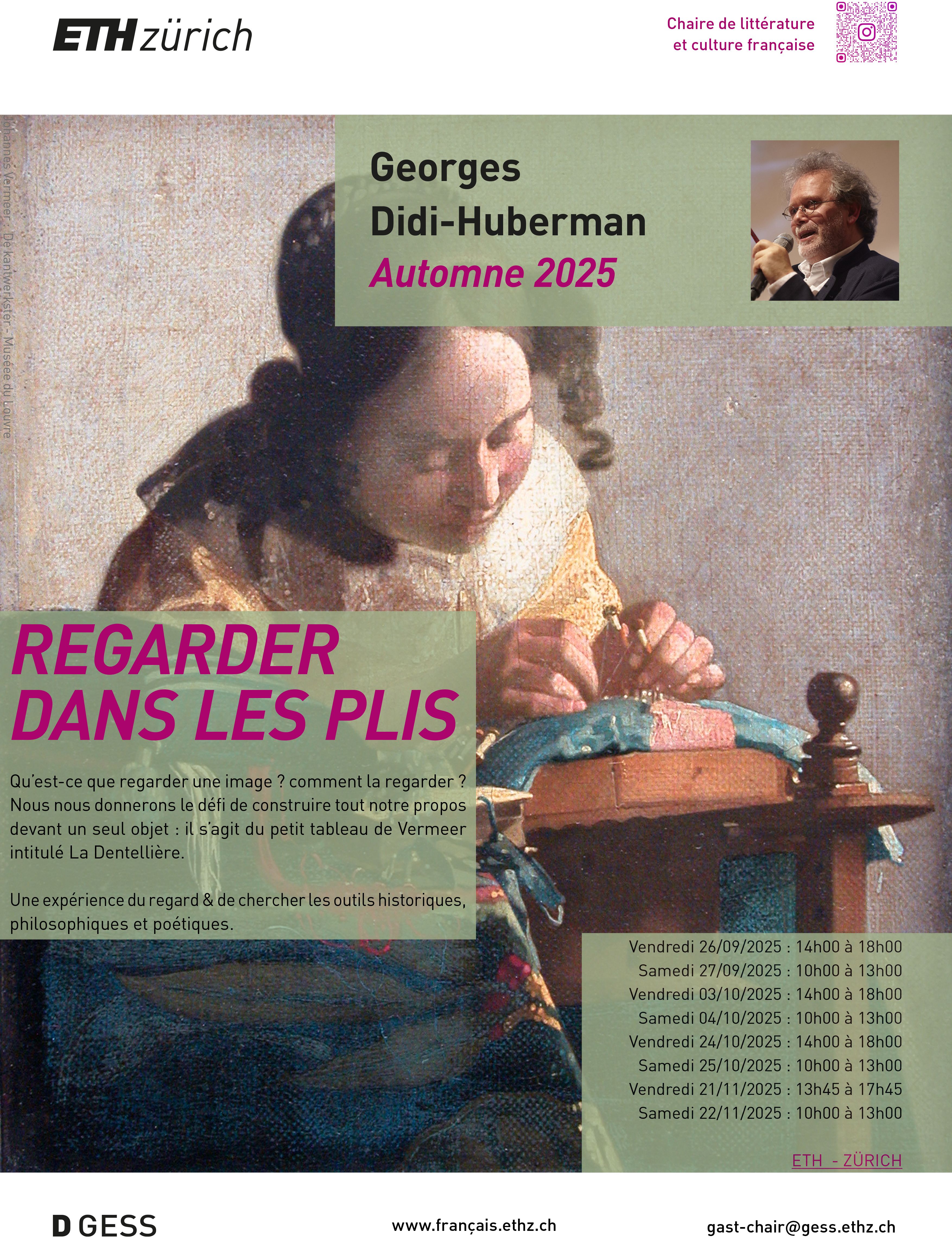 Le séminaire donné par G. Didi-Huberman à la Chaire de littérature et de culture françaises, au cours du semestre d’automne 2025, appliqua à l’observation d’un seul tableau «La Dentellière» de Vermeer, une série de réflexions basées sur ses théories retranscrites dans plus de 50 ouvrages d’études, une œuvre gigantesque. Tentons une reprise des concepts clefs et de leurs références afin de comprendre les principaux axes de son interrogation sur l’expérience visuelle depuis sa double position de philosophe et d’historien de l’art.